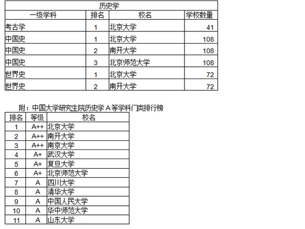 2015中国大学研究生院历史学A++级一级学科排行榜