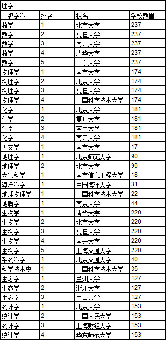 武书连2015中国大学研究生院理学A++级一级学科排行榜
