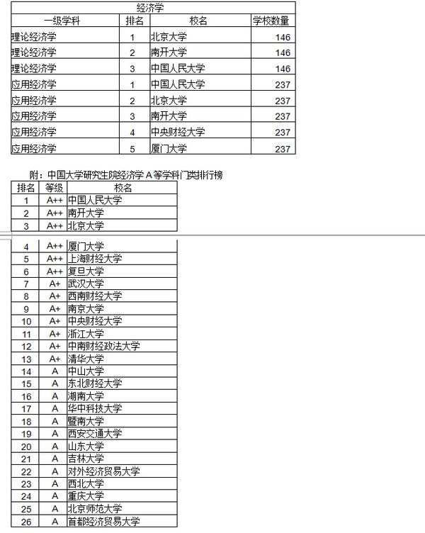 2015中国大学研究生院经济学A++级一级学科排行榜