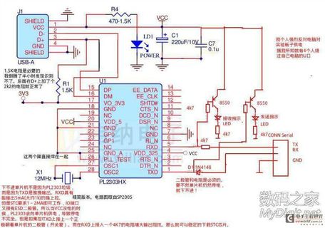 现在很多单片机都是3.3V供电的,那么VDD_325引脚上就要接3.3V电源,而PL2303上的V0_33脚恰好是经过USB_5V转出的一个3.3V电源,看网上很多人就直接将这个V0_33脚和VDD_325引脚相连,简单省事,我也这样做的!可是板子好了问题来了,因为此转换电路在接上主机后是一直处于上电状态,那么VDD_325引脚上就会一直有电,那么TXD和RXD上也就会一直有电,那么单片机就会一直有不确定的电……,那么单片机就没办法正常复位!!而且还会导致主机有时候死机。