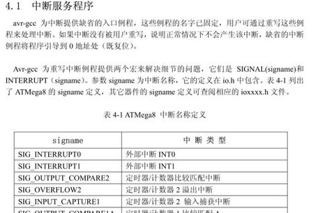 这是中断0的,这个在哪查询到的呢?在AVR 单片机GCC程序设计这本电子书,在第四章 功能模块编程示例 4.1首先就是中断服务程序看下图。