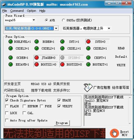 下载软件有很多、但推荐初学者使用Mucode isp 优点是熔丝位设置很清晰,不至于设错而锁死芯片
