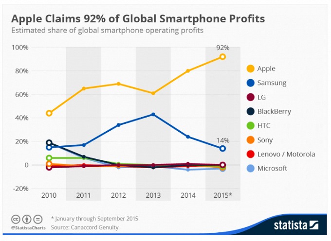 这显然不是什么好事。在Canaccord Tenuity分析师Michael Walkley出具的报告中,苹果和三星占据了智能手机市场105%的利润(注:占比之所以会超过100%,是因为不少手机厂商处于亏本状态,其利润占比为负值)。排除三星,苹果的利润占比更是达到九成以上。福布斯的最新分析文章认为:如果这种情况继续下去,预计苹果将会在2016年占据全球手机市场100%的利润。对,你没看错,按照福布斯的观点,苹果之外的所有厂商将在手机市场赚不到一分钱。
