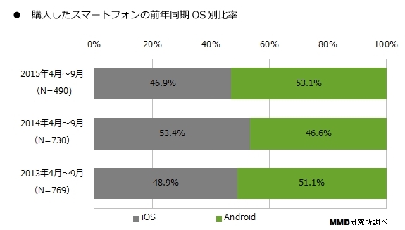 和以往一样,MMD研究所这一次的调查取样仍旧是非常的演进,选择了4-9月购买过智能手机、切年龄在15岁以上的男女用户490人。根据结果来看,其中购买iOS设备的用户占46.9%,而购买Android设备的用户则占到了53.1%,与去年同期的调查结果相比,今年购买Android设备的用户占比增长了6.8%。