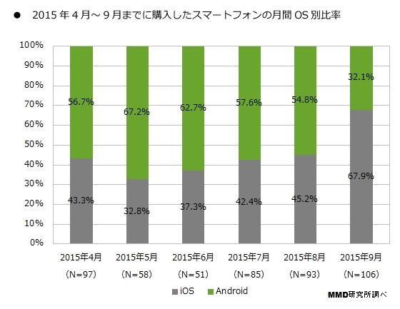 2015年4-9月日本Android购买量大于iOS购买量(数据引自MMD研究所)