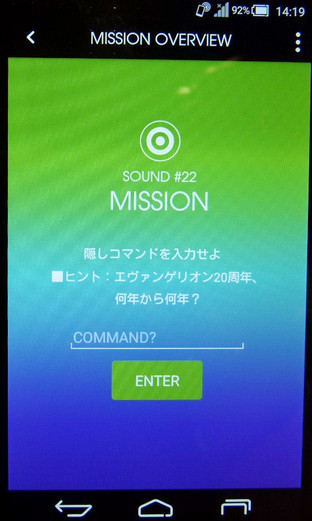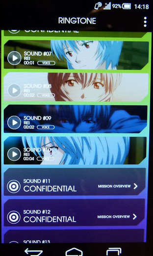 在音效方面,EVA20预装了55种不同的声音与效果音,除了新剧场版中使用的21种效果音外,还加入了事前调查中人妻最高的凌波丽、明日香、葛城美里、以及葛城的宠物企鹅penpen的34种不同声音。这些声音文件都可以在手机预装的原创app“EVASOUND”中找到,不过这55种声音与效果音并不是全部显示在app中的,有20种音源需要完成任务才能解锁,任务包括答题、启动EVASOUND 50天等等。
