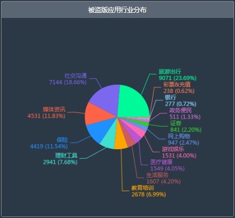 根据中国手机用户的行为习惯(关注中秋、国庆假期旅游出行计划)、应用使用广度以及黑客产业链盈利方式等因素,如下图所示,可以看出旅游出行类应用的盗版数占比最高,达到23.69%,其次是社交沟通18.66%、媒体资讯11.83%、保险11.54%。