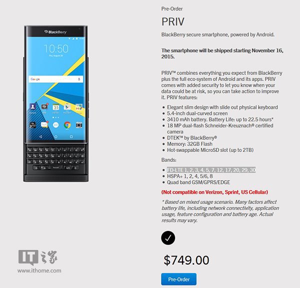 IT之家讯 10月22日消息,没有发布会,没有见面会,黑莓的第一部安卓机Priv现身官网预约页面,但该页面很快被黑莓撤下,可能是员工一时疏忽。但不管怎样,该机已全面曝光,预约价格为749美元,约合人民币4760元,将于11月16日发货。