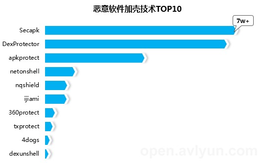 到目前为止,AVL移动安全团队共发现20余种Android应用加壳方案。图9中统计了被恶意软件使用最多的十大加壳方案。