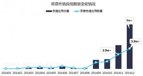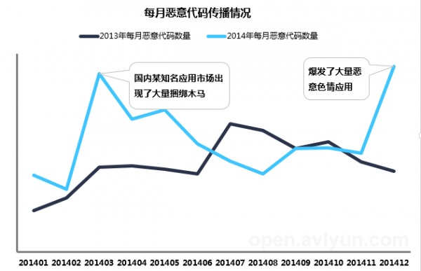 2014年,Android恶意代码出现两个传播高峰:第一个高峰出现在3、4、5月,当时国内某知名应用市场出现了大量捆绑木马,另一个高峰是由于12月爆发了大量恶意色情应用。