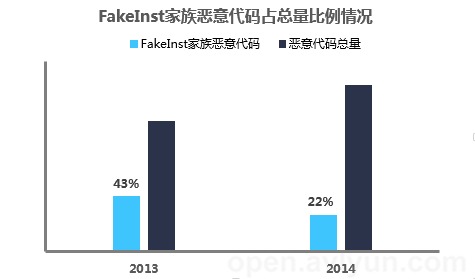 分 类统计Android恶意代码后发现,近两年FakeInst家族恶意代码数量在全年恶意代码总量中比重较大(如图2所示)。2013 年,FakeInst家族恶意代码数量占全年总量的43%。到2014年,该比例降到22%,这在一定程度上影响了Android恶意代码全年总量的变化 趋势。