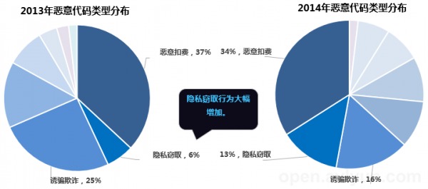 2014年,Android恶意代码的主要行为依然是恶意扣费。由于短信拦截木马的爆发,导致隐私窃取类恶意代码数量增长明显。