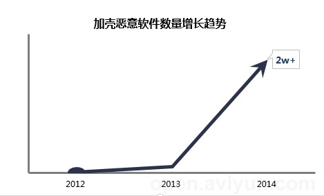 2014年,更多恶意软件采用加壳技术躲避安全软件的查杀。2013年到2014年仅一年时间,加壳恶意软件数量就增长了约18倍(如图8所示)。