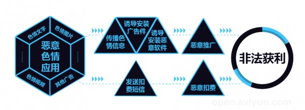 恶意色情应用主要利用低俗内容引诱用户下载,安装后会在后台不断推送恶意应用,消耗手机流量、非法赚取推广费用甚至发送扣费短信,逐步形成一条通过恶意推广和恶意扣费进行非法牟利的灰色利益链。