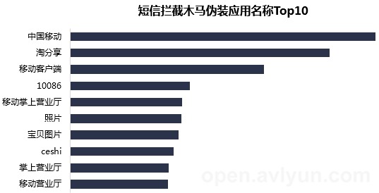 据统计,短信拦截木马一般会伪装成中国移动相关的应用名称,诱导用户下载安装。当前伪基站只能针对2G网络,中国移动的2G用户基数最为庞大,因此短信拦截马主要是攻击使用中国移动2G网络的手机用户。图15统计了短信拦截木马伪装应用名称Top10。