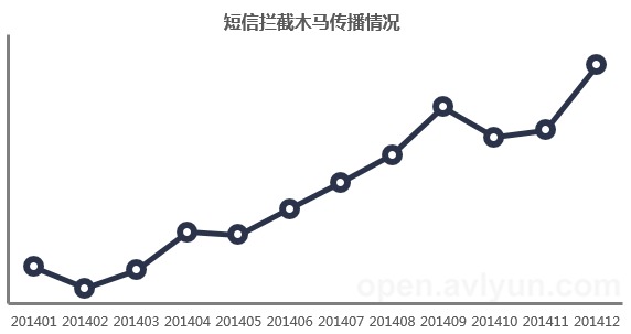 恶 意扣费依然是Android恶意代码的主要行为,体现出恶意代码的趋利性。2014年,由于短信拦截木马的大规模爆发,导致隐私窃取类的恶意代码数量增长 明显。攻击者通过窃取用户银行账户、密码等重要隐私信息,最终给用户造成资金损失。因此AVL移动安全团队建议用户,不要随意点击短信、QQ、微信等聊天 工具中发来的链接。