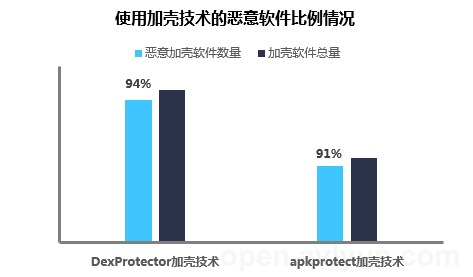 值得注意的是,使用DexProtect和apkprotect加壳技术的恶意软件占比极高(如图10所示),很可能是专门为恶意代码开发的加壳方案。