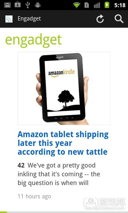 (Google Reader应用在设备顶端显示一个小的旋转符号,每当应用在后台加载内容时这个符号就会出现,这样你就会意识到自己或许需要等待一段时间。)