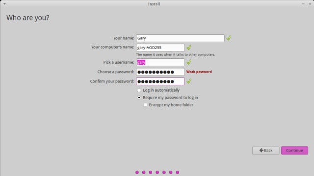 如果你想要系统自动登入,而不是在每次启动的时候输入密码,选择“Log in automatically”。建议用户更好的选项是“Require my password to log in”,并且如果你想要更高的安全等级,勾选“Encrypt my home folder”选项。