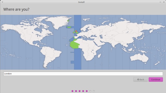 需要通过点击底图来选择你的地区。系统根据你的选择来设置时区,时钟就可以显示正确的时间了。选择以后点击“Continue”。