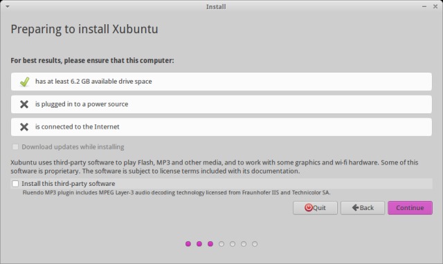 安装过程中,如果电池电量不足才必须要链接到到电源。值得注意的是如果连网,这里有一个关闭安装过程中下载更新包的复选框。另外一个复选框,提示你是否安装用于播放MP3或者Flash视频的第三方软件,均也可以在安装完成以后进行。