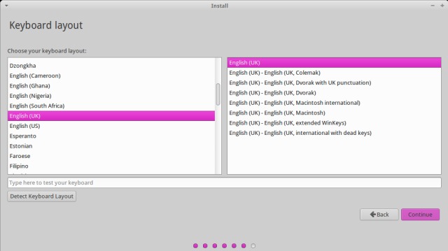 在左边的列表中选择键盘语言,然后右边列表显示确切键盘布局。点击“Detect Keyboard Layout”让系统选择最适合的键盘布局。如果需要确认键盘布局,可以在“Type here to test your keyboard”输入字符。你需要特别注意fn键和一些符号,例如英镑和美元符号。