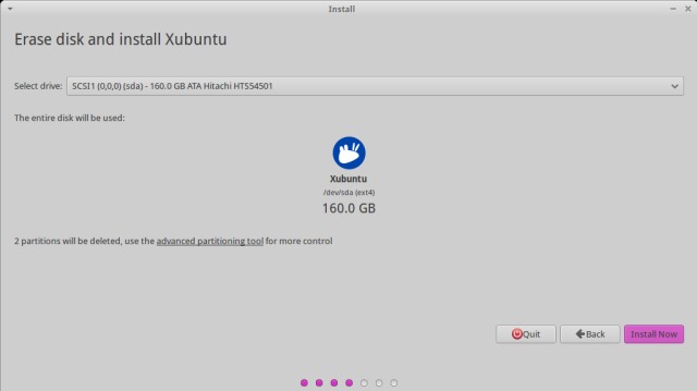 清除磁盘并且安装Xubuntu,选择你要安装Xubuntu的磁盘。点击“Install Now”,会弹出一个警告窗口,会提示你选择的磁盘驱动器会被完全清除,然后会显示一个新创建的分区列表。