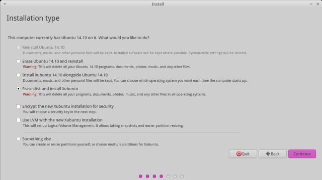 该教程只是用来说明如何在计算机上安装Xubuntu,而不是怎么安装双系统,那将是一个完全不同的教程。选择使用Xubuntu替换当前系统,然后点击“Continue”。