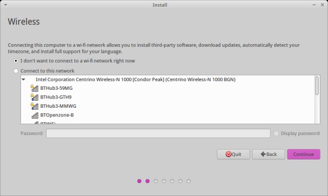 第二步,需要选择你的网络链接。这个步骤不是必须的,用户可以再这个阶段可能会选择不设置网络链接。如果网络状况不理想建议不选无线网络,因为会在安装过程中从网络上自动更新,导致安装过程就会花费很长的时间。