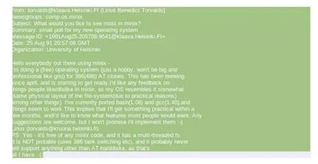 1991年8 月25 日,赫尔辛基大学大二学生林纳斯托瓦兹(Linus Torvalds),在MINIX 新闻组(comp.os.inix)发布了一则标题为“在 MINIX 系统中你最想看到什么?”的主题,具体内容是: