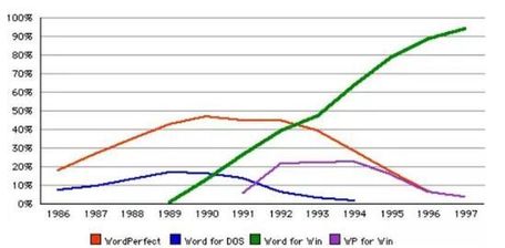 Office系列三大应用Word、Excel、PowerPoint各自都处在快速上涨的区间中。1994年前后,这三个应用的市场份额超过50%,1998 年接近100%。