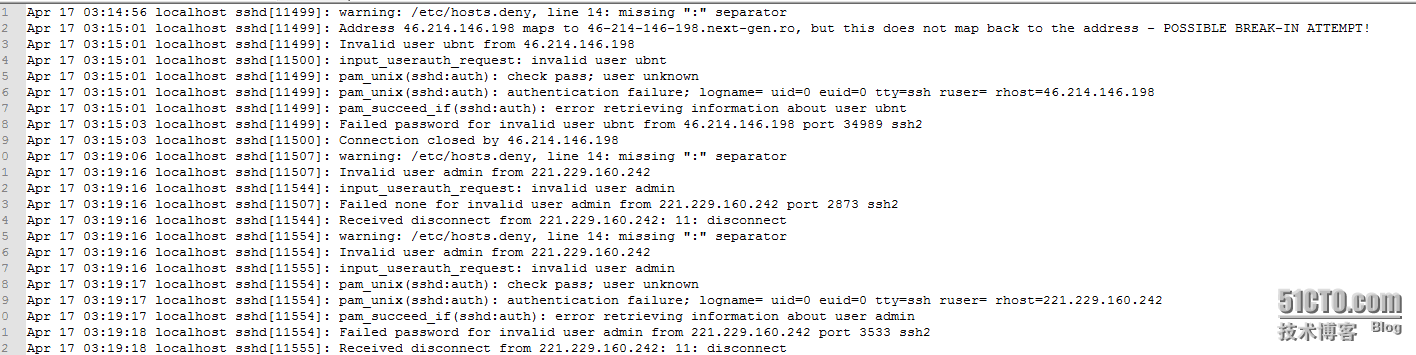 Apr 17 03:14:56 localhost sshd[11499]: warning: /etc/hosts.deny, line 14: missing ":" separator