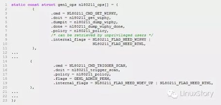 在内核中,由 nl80211 接收应用层发出的命令。如下代码展示了对应绑定情况。