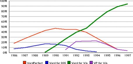 Office 系列三大应用 Word、Excel、PowerPoint 各自都处在快速上涨的区间中。1994 年前后,这三个应用的市场份额超过 50%,1998 年接近 100%。