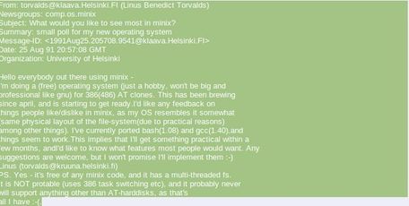 1991 年 8 月 25 日,赫尔辛基大学大二学生林纳斯托瓦兹(Linus Torvalds),在 MINIX 新闻组(comp.os.inix)发布了一则标题为“在 MINIX 系统中你最想看到什么?”的主题,具体内容是: