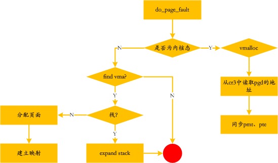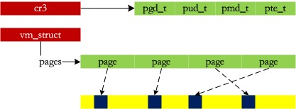 在实际需要某个虚拟内存区域的数据之前,和物理内存之间的映射关系不会建立。如果进程访问的虚拟地址空间部分尚未与页帧关联,处理器自动引发一个缺页异常。在内核处理缺页异常时可以拿到的信息如下: