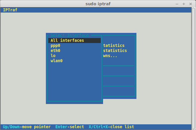如果不加任何命令行选项地运行iptraf命令,程序将进入一种交互模式,通过主菜单可以访问多种功能。