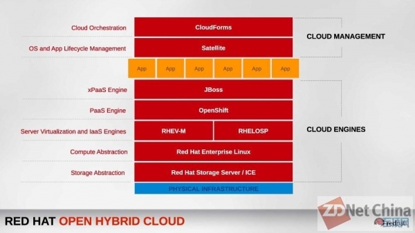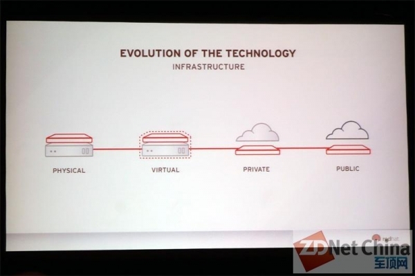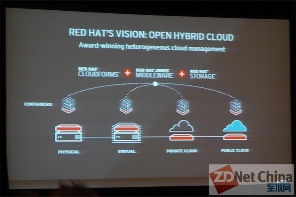 企业IT基础设施平台的4种形态,物理机、虚拟机、私有云、公有云,在RedHat看来,4种形态的有机融合才是真正 的“混合”,如果未来的IT就是涵盖这4种IT平台的云的话,那么这才是真正的混合云(Hybrid Cloud)
