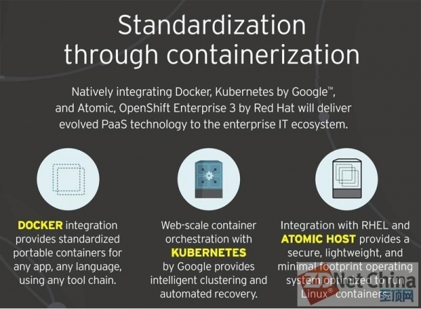OpenShift Enterprise V3的主要更新就是三个:1、标准化的Docker引擎与Registry(用户可以自己建立Registry供内部镜像分发);2、支持并集成Google的Kubernetes容器调度平台,极大的方便了Docker的大规模集群管理;3、集成RHEL(RedHat Enterprise Linux)与专门为容器优化并做安全加固的轻量级Linux主机平台RHEL Atomic HOST