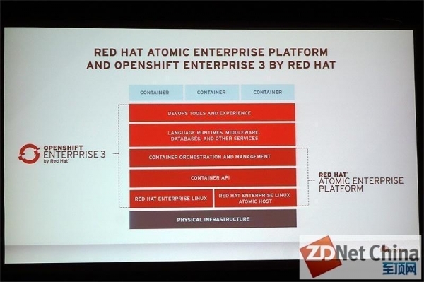 好了,回到本次峰值上的重要发布,在我看来,最大的亮点就是PaaS平台OpenShift Enterprise V3,以及Atomic Enterprise Platform,但严格的计划,后者是前者的一个子集,所以重头戏仍然是OpenShift Enterprise V3。按RedHat的话说,它是目前业界第一个全面支持Docker容器创建与集群管理的企业级PaaS平台,为企业用户提供了完整的On Premise(用户私有)与混合的容器应用平台,让容器技术得以真正的进入传统企业,帮助它们构建面向未来的混合IT应用环境。