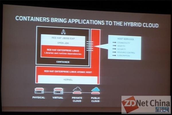 RedHat最终的目的在于通过容器将应用融入混合云的平台之上,这张图也进一步说明了Atomic HOST的作用,而RedHat的中间件平台JBOSS将以容器镜像的形式交付并进行优化,以全面贯彻RedHat的容器战略