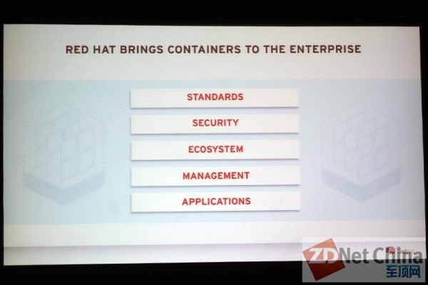 需要强调的是,除了新发布的产品全面支持容器之外,RedHat还宣布了将容器带入企业级应用环境的推进战略,而新发布的产品可以认真是这一战略中相关层面的具体执行。RedHat的容器企业推进战略,包括了标准化、安全、生态系统、管理以及应用5大部分。