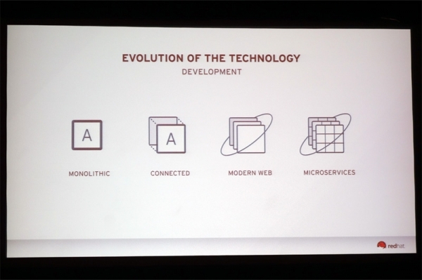 企业IT的4种应用开发形态:传统的单一完整应用、相互关联的应用、现代化的Web应用以及当前越来越流行的微服务,在RedHat看来,容器技术为整合这4种应用形态提供了可能和基础,从而让混合IT在应用层面上实现了统一
