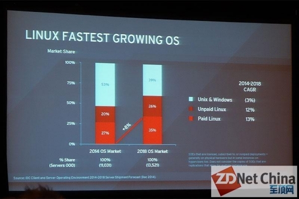 根据IDC的报告,到2018年,UNIX/Windows服务器在总体服务器出货量中的份额将比2014年下降14%(年均复合增长率为-3%),这部分市场将转移至Linux,其中安装付费Linux的服务器的出货量将较2014年提升8%,年均复合增长率为13%,免费Linux则将提升6%,年均复合增长率为12%