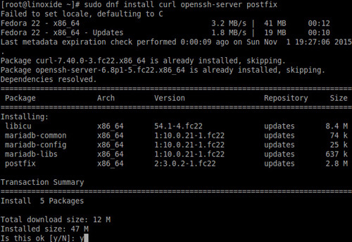 在 Fedora 22 中,由于 yum 已经被弃用了,默认的包管理器是 dnf。为了安装上面那些需要的软件包,我们只需运行下面的 dnf 命令: