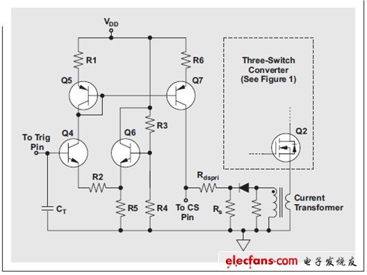 图 4 显示了用于产生期望电流的一个电路。该电路基于 UCC2807-1 控制 IC,VDD 设定为 11V。“三角”斜波的谷值电压和峰值电压为 3.667V 最小值和 7.33V 最大值,并且最小值到最大值的时间等于最大“开”时间。在该电路中,R3 等于 2 倍 R4。这样便让 Q6 基极的电压等于 1/3VCC,其为“三角”电压的谷值。由于“三角”引脚的电压在谷值到峰值(2/3VCC)之间摆动,R2 的电压便在 0 到 1/3VCC 之间线性变化。给 R2 选择一个值,让其获得 70.7 A 的电流和 3.667 V 的 (51.8 kΩ) 电压,然后使用 Q5/R1 和 Q7/R6 构建起统一电流反射镜。这样,设计人员便可以生成电流检测信号,将所需电流加至电流检测信号,并拥有正确的形态和 1Kω 电阻计时。