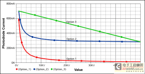 图3. PSPICE仿真结果:光电二极管电流与电位器阻值的对应关系