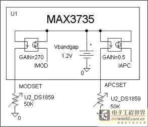 MAX3735 (图5)采用电流镜产生调制电流和APC的设定值。利用1.2V带隙基准设定MODSET和APCSET节点的电压。这些节点的对地电阻定义了镜像电流。MODSET电流乘以镜像增益270,得到最终的电流值。APC控制环路会伺服激光器功率,直到光电检测二极管电流等于APCSET定义的电流值。光电检测二极管电流是APCSET节点电流的一半(MAX3735数据资料中给出的APCSET增益为1是错误的)。