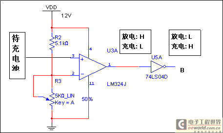 ①运用电压比较器监测电池电压,保证至充电终止电压时,能及时关断充电电流并锁定“充电结束”状态。
