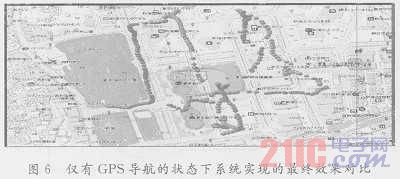 仅有GPS导航的状态下与在GPS+GSM共同导航的状态下系统实现的最终效果对比如图6,图7所示。